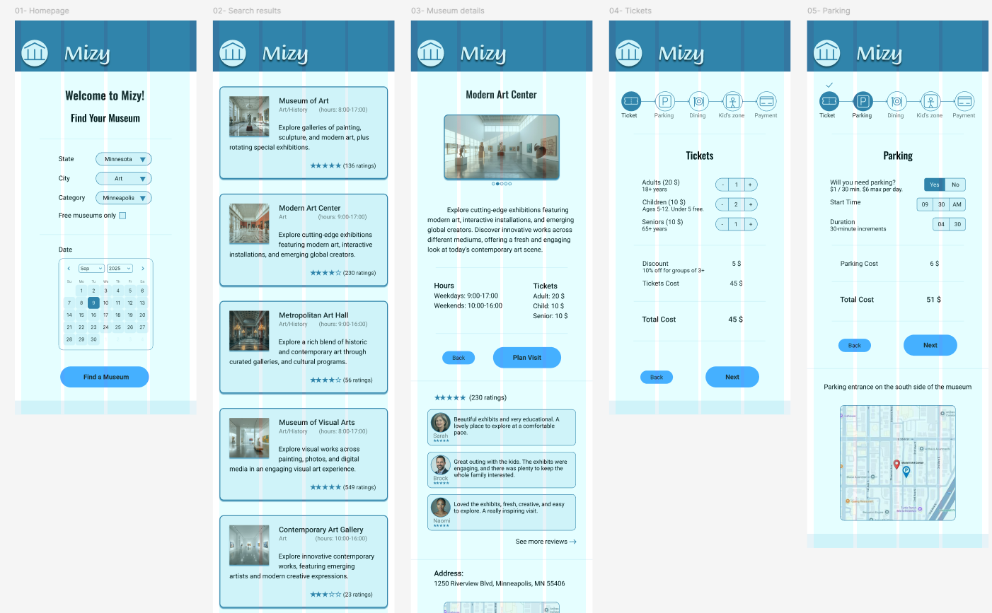 In the next iteration, the app was renamed "Mizy" to improve memorability. The homepage was updated to include categorized museum search, and additional detail pages were introduced to provide clearer search results. Finally, a more structured step-by-step flow was implemented, supported by a visual progress indicator at the top of the screens and more detailed booking forms (Figure 8).